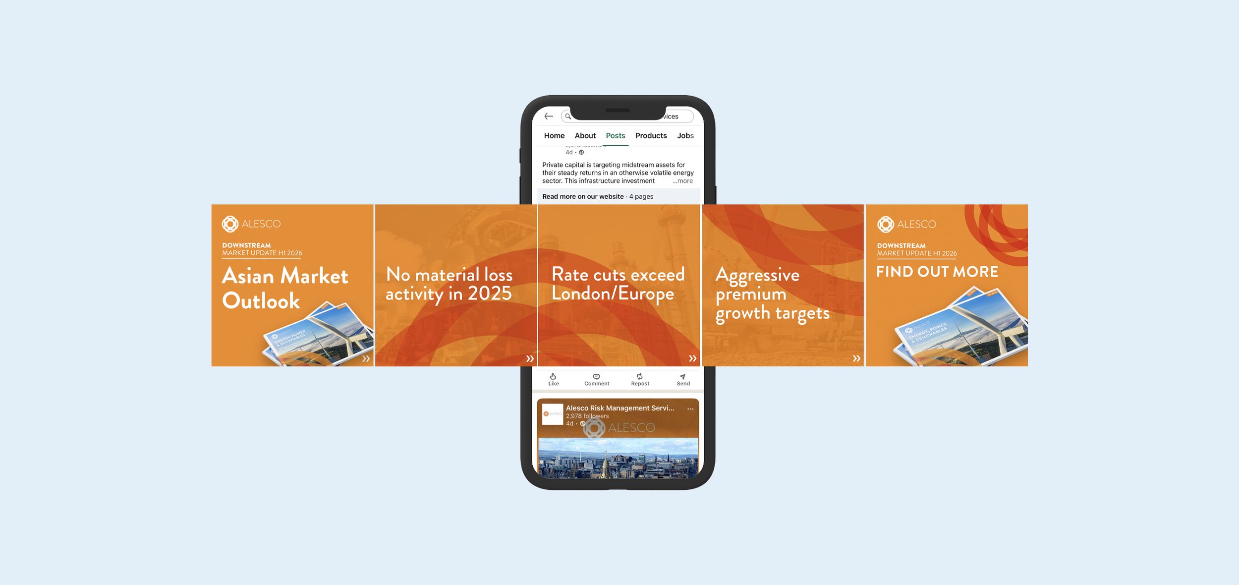 In addition to Gallagher, I also art direct all material for Alesco, a brand directed at a US audience. Working with similar subject matter as Gallagher Specialty, I developed a set of templates and guidelines that incorporate the distinctive Alesco logo and colour palette, for use over screen, print, video and social media.